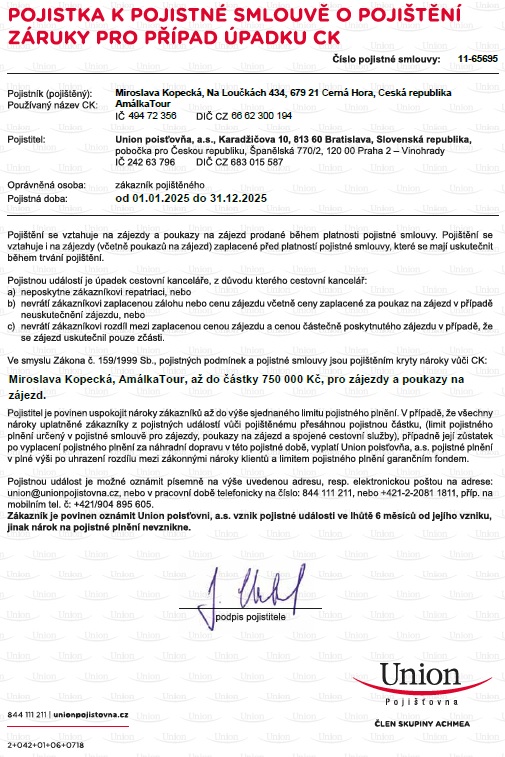 Dle zákona č.159/1999 Sb. O některých podmínkách podnikání v oblasti cestovního ruchu musí mít cestovní kancelář sjednáno pojištění záruky pro případ úpadku cestovní kanceláře. Cestovní kancelář Amálkatour má sjednané pojištění u Union pojišťovny, a.s. Všechny naše zájezdy zahrnují pojištění proti úpadku, které je součástí ceny. Pojištění dle zákona musí zajistit zákazníkovi pojištěnému cestovní kanceláří právo na plnění v případech kdy cestovní kancelář z důvodu svého úpadku: