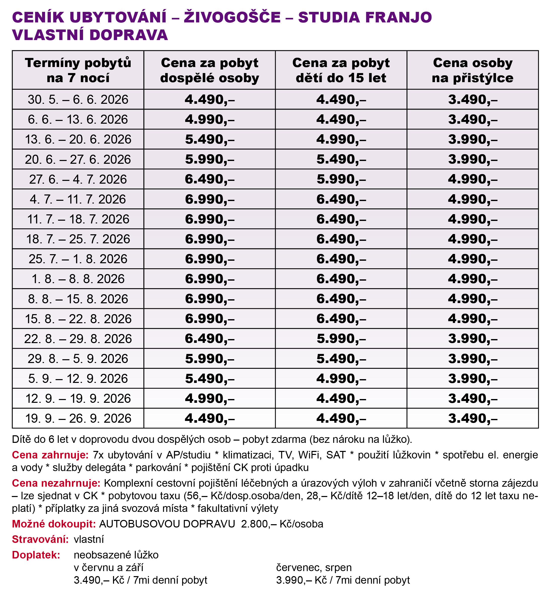Studia „ FRANJO***“ jsou situována cca 60 m od moře. Před domem se nachází rovná travnatá plocha, která navazuje na kolonádu a překrásné pláže s pozvolným, vstupem do moře. Každé studio má z terasy či balkonu boční nebo čelní výhled na moře.